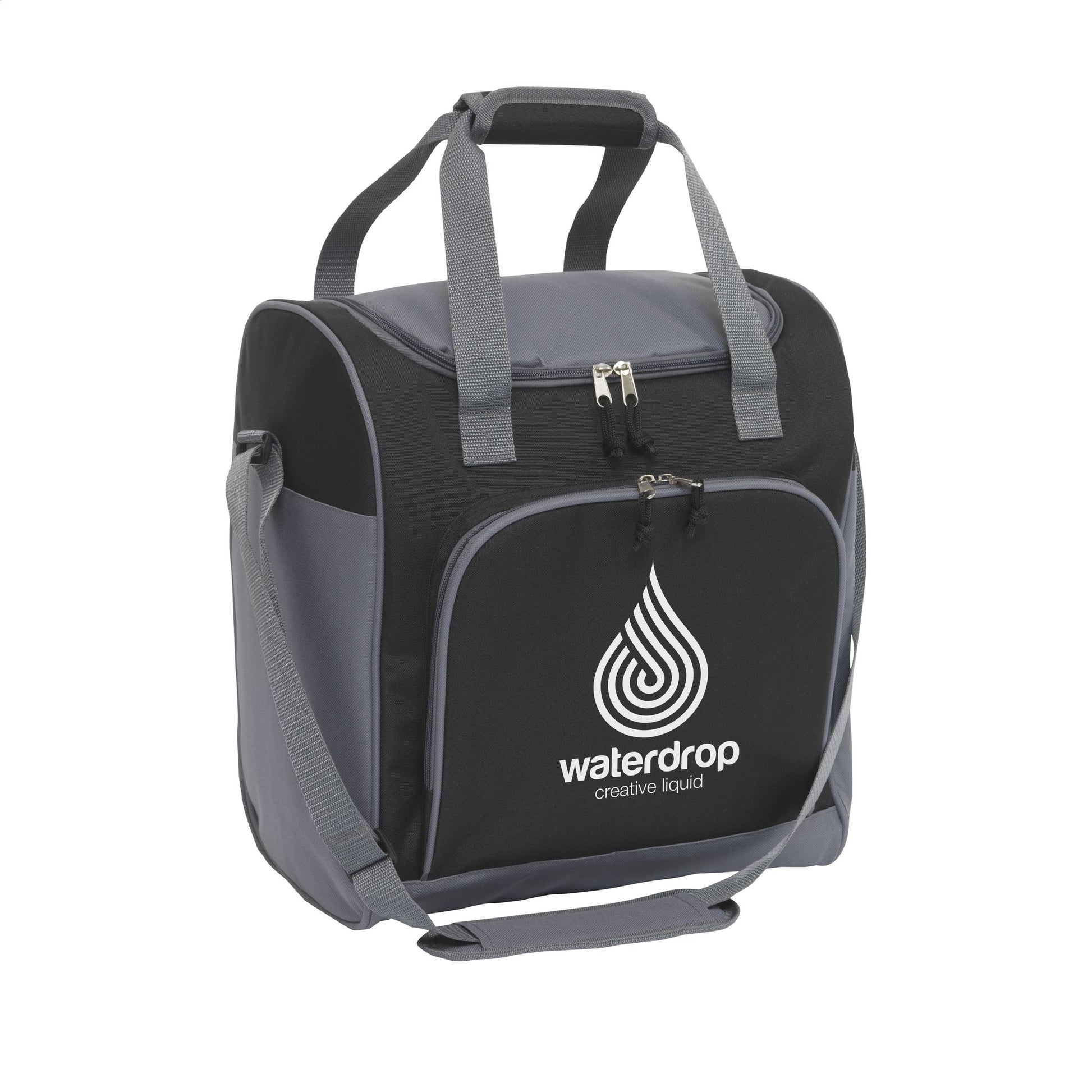 Feste Kühltasche aus 600 D Polyester. Mit einem großen Kühlfach und einer Reissverschlusstasche, anpassbarem Schulterriemen mit Schulterpolster und 2 Griffen. Großes Fach: passend für 6 Flaschen mit bis zu 2 Litern.