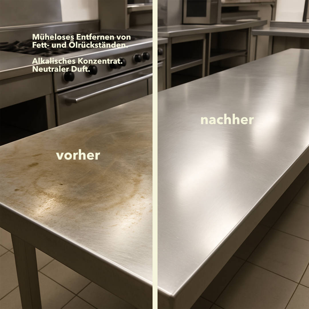 Ob in Großküchen, Werkstätten oder Industriebetrieben – dieser kraftvolle Fettlöser entfernt hartnäckige Fett- und Ölrückstände mühelos. Dank des extrem hohen pH-Werts von 13 löst er Verschmutzungen schnell und zuverlässig. Geeignet für den maschinellen oder manuellen Einsatz mit Wischmopp oder Bürste.