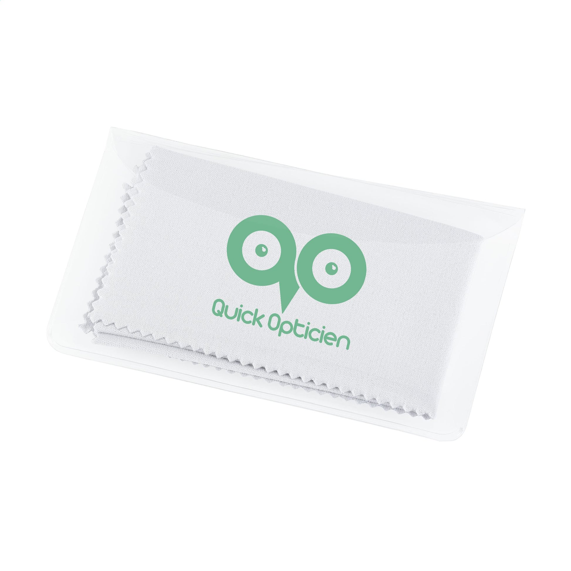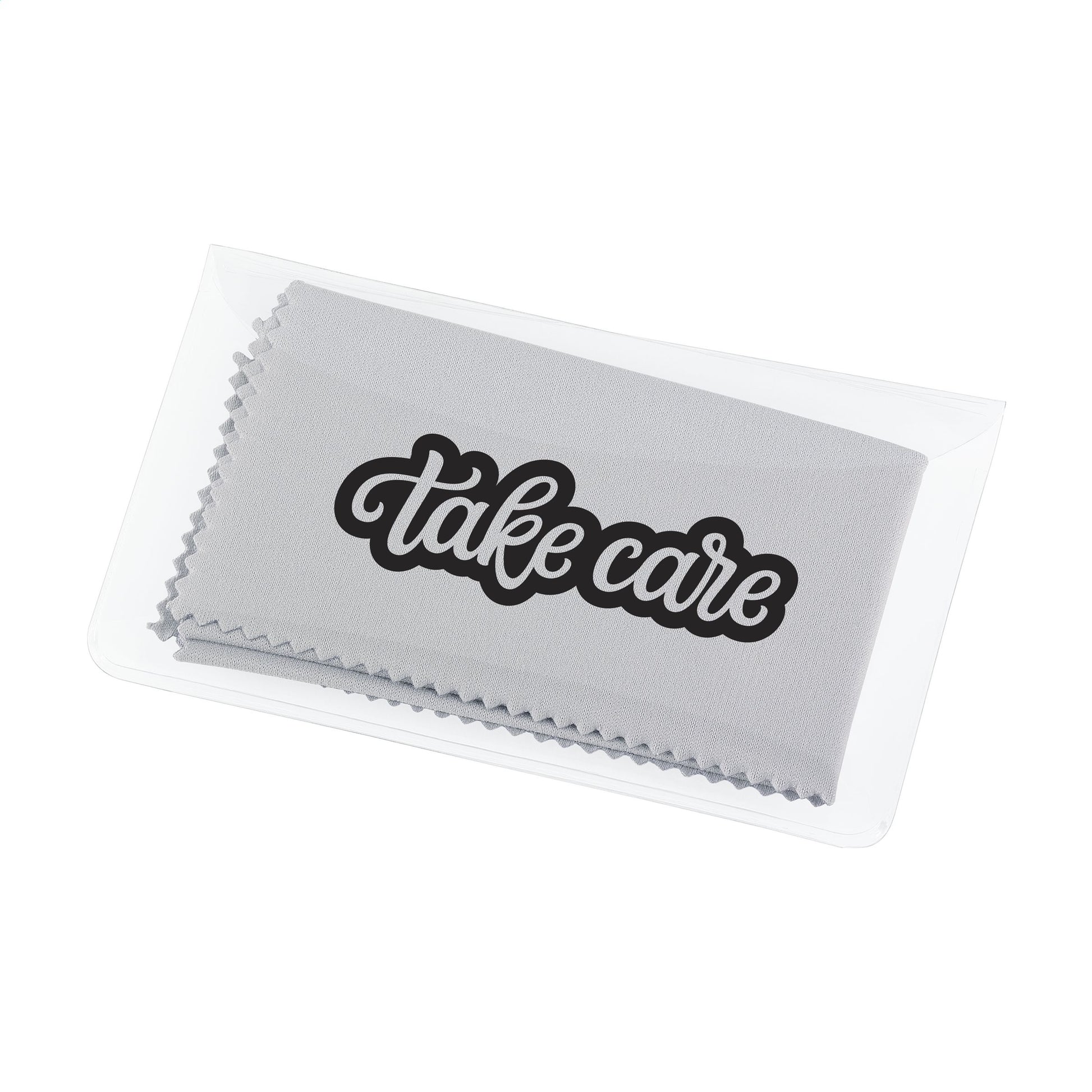Praktisches Reinigungstuch aus Mikrofaser (18 x 15 cm) in einem kompakten, transparenten Kunststoffetui. Standardaufdruck auf dem Etui.