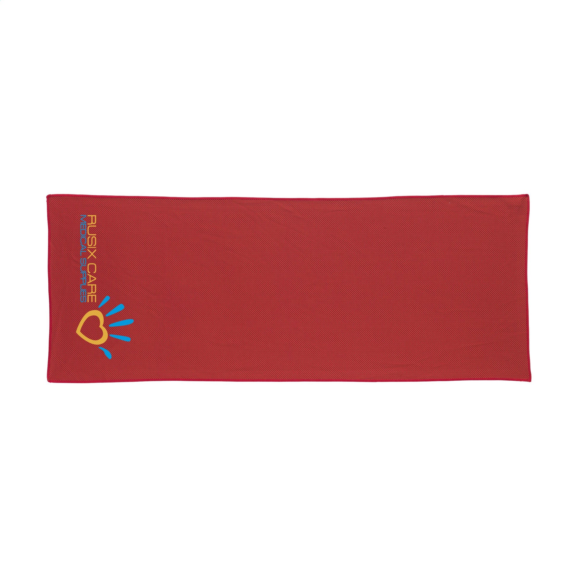 Spezielles Kühlhandtuch aus 100 % Polyester. Nach dem Eintauchen in kaltes Wasser kann dieses Handtuch bei sportlichen Aktivitäten oder Sonnenbrand kühlen. Ideales Format, um es zur Kühlung im Nacken zu tragen. Die Vorderseite des Handtuchs ist in Netzstruktur, die Rückseite ist glatt und hat einen dunkleren Farbton als die Vorderseite.
