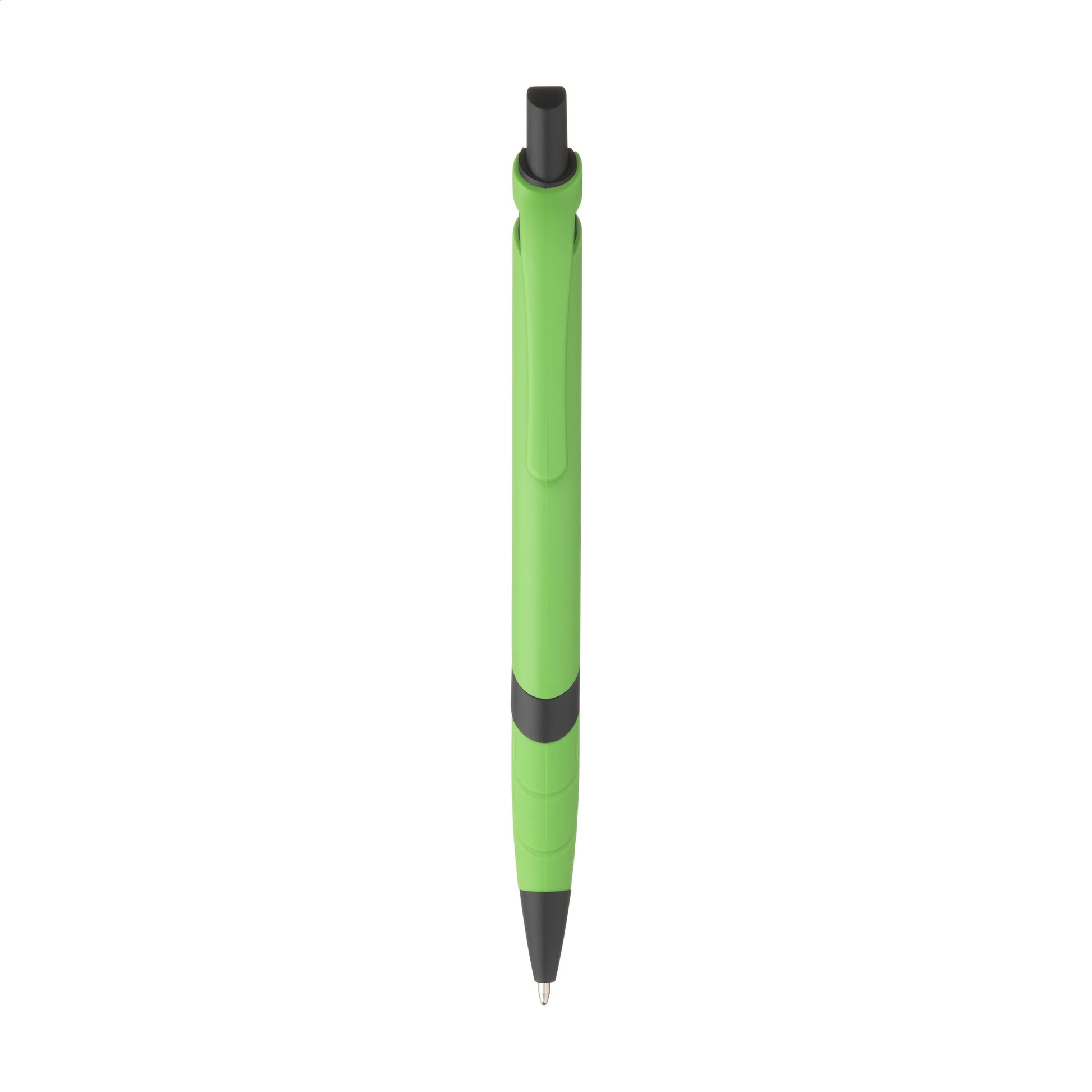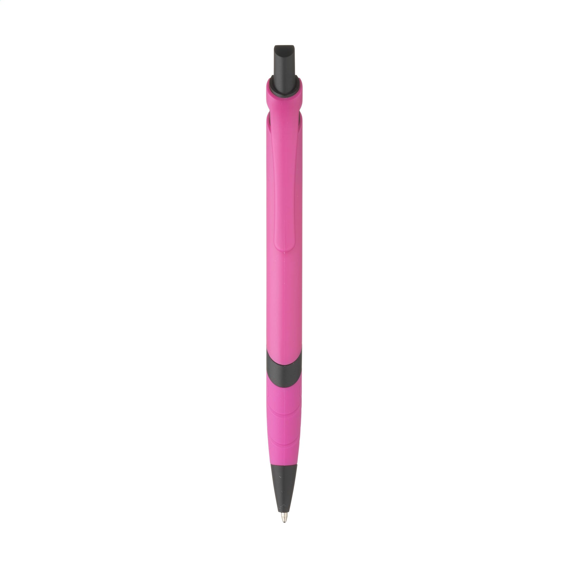Blauschreibender Kugelschreiber mit mattem Gehäuse, schwarzen Farbakzenten und grifffestem, gummierten Vorderteil.